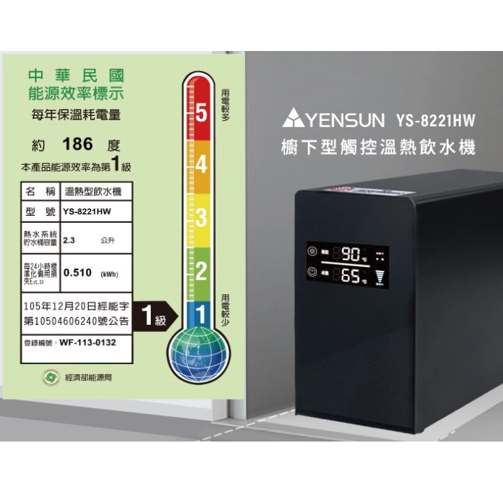 ※最大常溫水流量2.2L/min,因儲水桶的水用盡後,需重新補水加熱,故規格貼紙 出水量標示6.5L/h之計算為包含儲水桶重新補水加熱時間。